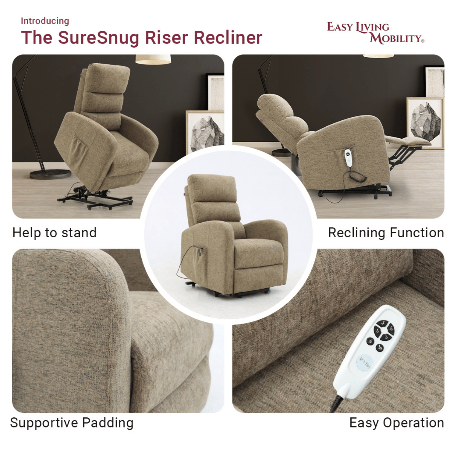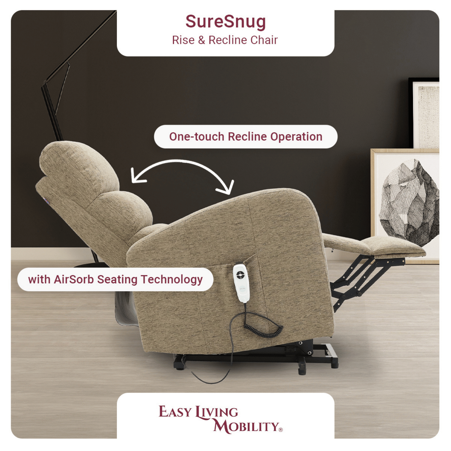 Our SureSnug range has been crafted by our skilled British design team to provide effortless user friendly assistance when transferring to and from the chair, our clean simplified remote gives any user clear direction on how to transition from a relaxing, laid back position to almost standing with frictionless operation.